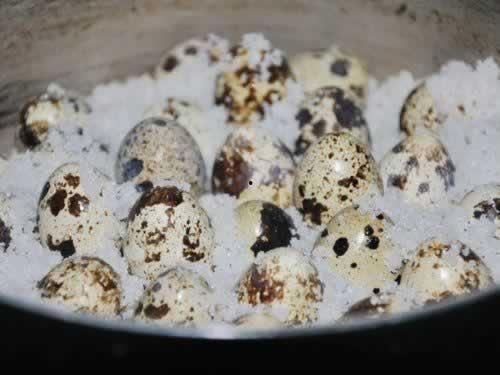 4. 放入鹌鹑蛋:将腌制好的鹌鹑蛋均匀地摆放在盐上,确保每个鹌鹑蛋都能被盐覆盖。